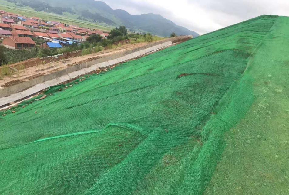 三維植被網(wǎng)是由多層塑料凹凸網(wǎng)和高強(qiáng)度度平面網(wǎng)經(jīng)熱熔后粘結(jié)而成的一種穩(wěn)定的立體網(wǎng)結(jié)構(gòu),其面層外表凹凸不平,材質(zhì)疏松柔韌,90%以上的空間可填充土壤,底層平面網(wǎng)擁有延伸率低,高強(qiáng)度的特點(diǎn),起著預(yù)防坡體回落的效果。利用它組合噴播植草,植物的根系可以從整個(gè)三維土工網(wǎng)墊中均勻穿過(guò),深入地下0.5--2cm,植被,網(wǎng)墊和土壤三者產(chǎn)生牢固的復(fù)合力學(xué)嵌所體系,擁有不錯(cuò)的柔韌性,當(dāng)邊坡出現(xiàn)是、沉降可隨時(shí)之沉降,是一種永久性的邊坡防護(hù)方法。