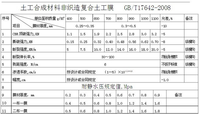土工布,復(fù)合土工膜,國家標(biāo)準(zhǔn)技術(shù)指標(biāo)匯總