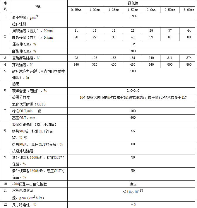 HDPE土工膜技術(shù)性能指標(biāo)(最低值)